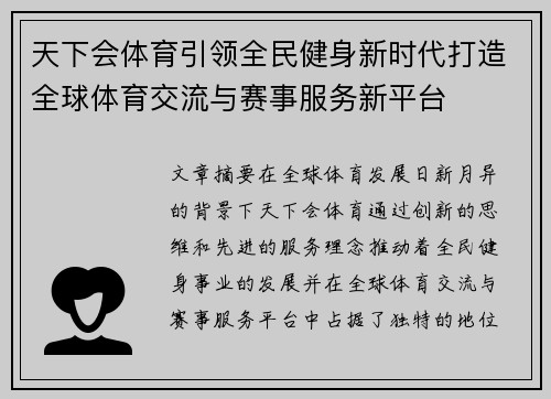 本文旨在深入探讨中央体育发展新格局与全民健身战略深度融合的研究与实践探索。随着国家体育事业的不断发展,中央体育发展的新格局已成为推动全民健身的重要驱动力。全民健身战略不仅是提升国民体质、改善民生的有效途径,也是促进社会和谐、推动经济发展的重要手段。文章将从四个方面展开论述,具体包括:中央体育发展新格...